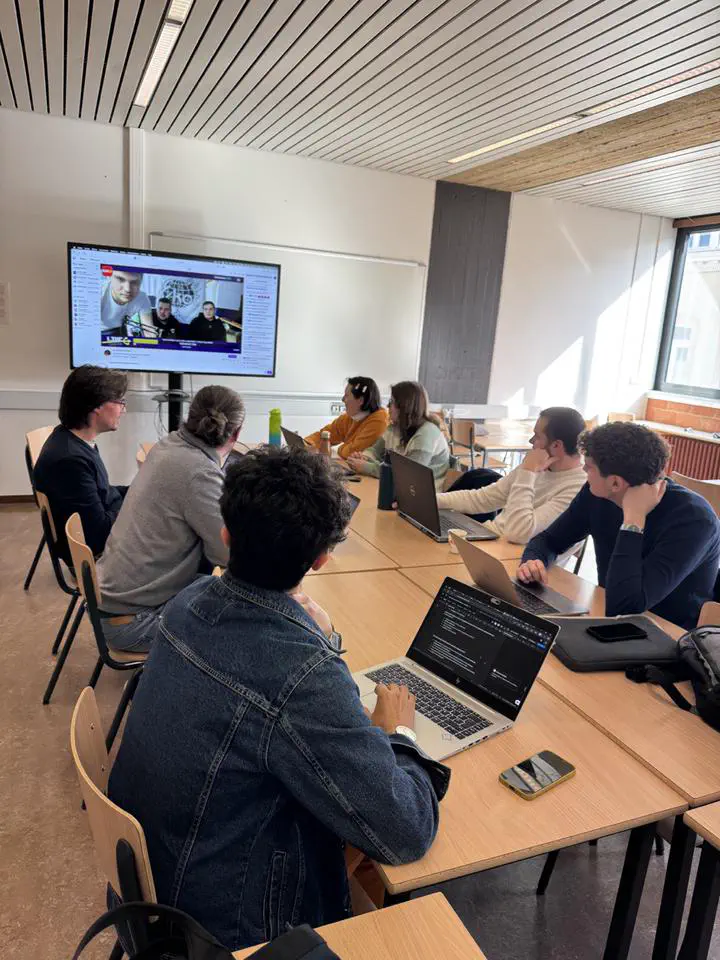 Deux semaines passent, le premier cours arrive avec les (seuls) six étudiants·es qui ont choisi la finalité et Jérôme Maquoi, notre assistant pour le cours qui n’avait aucune idée de ce que l’on préparait. Nous sommes le 12 février 2025 dans un séminaire : deux profs de la faculté, tout fiers d’avoir une approche différentiée, présentent le résultat de leurs cogitations à ce petit monde. Le plan est simple : on travaille ensemble pour construire un outil de mesure, on contacte nos partenaires industriels pour collecter des données et on produit une première version d’un rapport des pratiques de test et qualité en Fédération Wallonie Bruxelles. Autant dire que l’idée d’avoir des profs qui travaillent directement avec les étudiants·es les a un peu déstabilisés·es… en tout cas, au début. S’en sont suivi une réorganisation de l’espace de travail pour avoir une grande table et un écran sur lequel projeter les documents édités ensemble, une réorganisation de l’espace Teams pour faciliter le partage de documents et d’information et l’instauration de stand-ups au début de chaque séance de cours pour faire l’état des lieux de l’avancement des travaux.